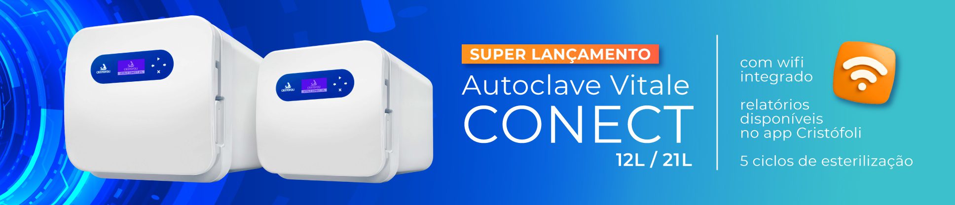 Autoclave Vitale Conect 12L Cristófoli, Classe S, desenvolvida para esterilização de artigos e instrumentos termorresistentes embalados e desembalados utilizando vapor saturado sob pressão. Ideal para consultórios odontológicos (clínica geral, endodontia, odontopediatria, ortodontia, prótese, dentística e estética) e consultórios médicos (dermatologia e oftalmologia).