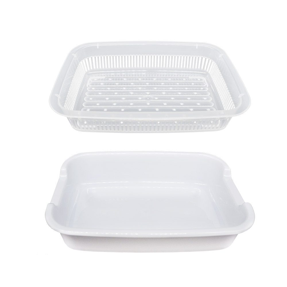 Conjunto com 3 peças: bandeja, escorredor e tampa.