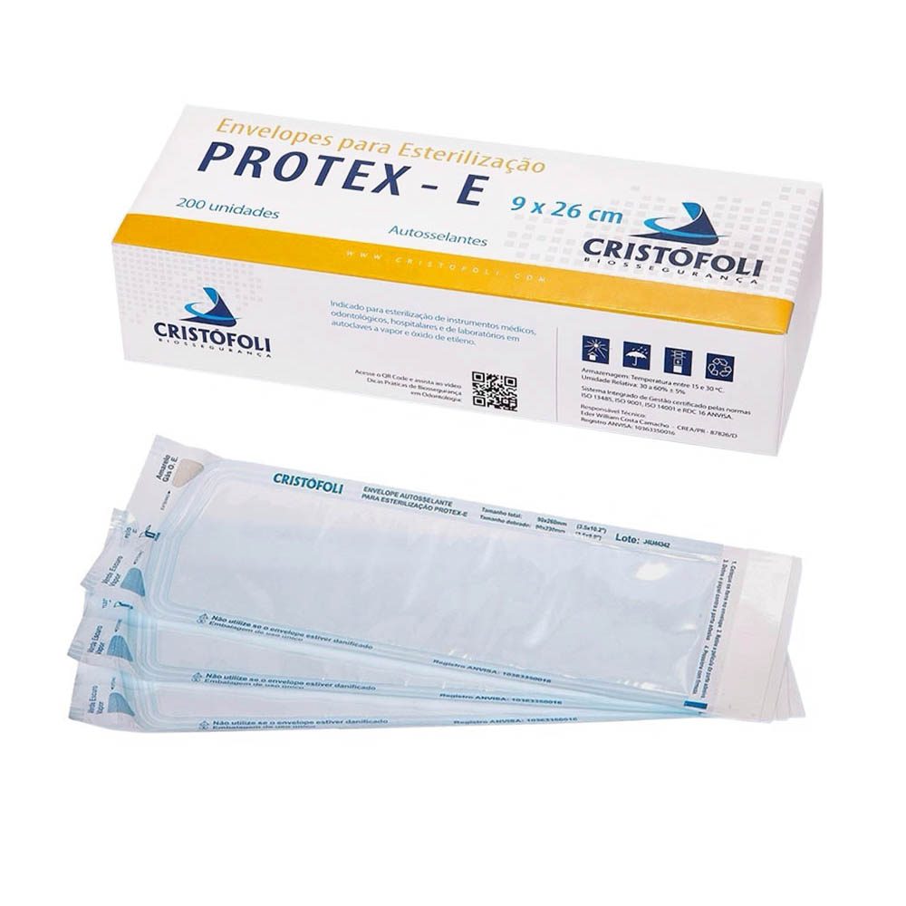 Envelopes para Esterilização Protex-E 9x26cm, autosselantes próprios para processos de esterilização por vapor saturado sob pressão e óxido de etileno.