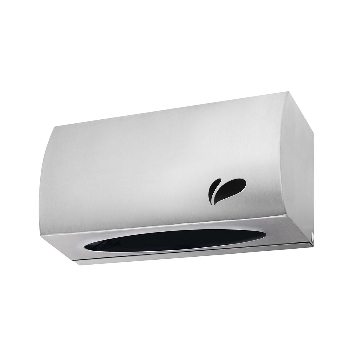 Mini dispenser de parede para papel toalha interfolhado, em aço inox escovado. Com fechadura e chave de metal.