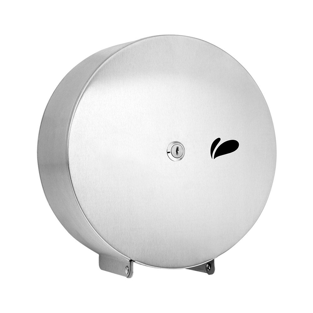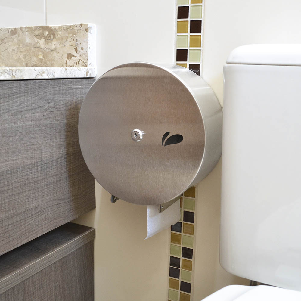 Dispensador manual de papel higiênico em aço inox escovado de alta qualidade, com visor e chave.